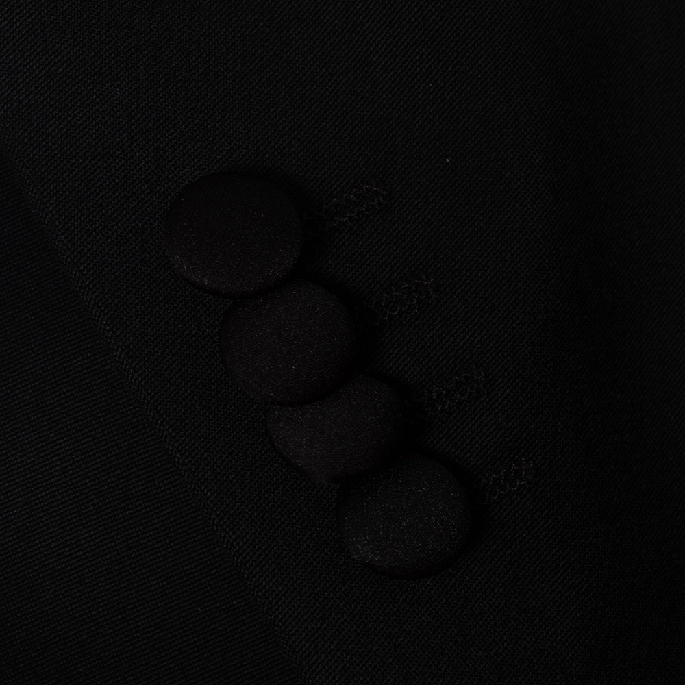 Son col à revers à pointe satinés, aux lignes nettes et structurées, signe une allure formelle et puissante, idéale pour les grandes occasions.