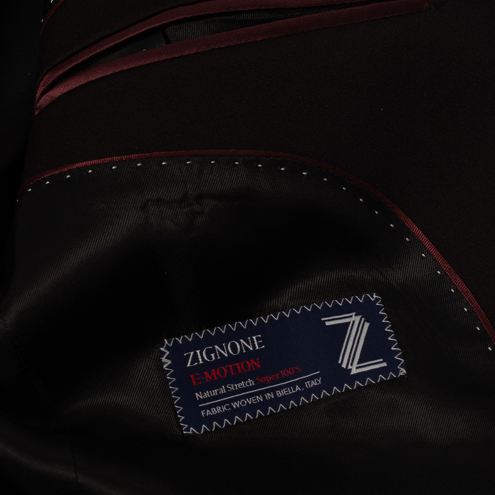 Le tissu provient de Zignone, prestigieuse maison de tissage italienne située à Biella, reconnue pour ses étoffes haut de gamme. La ligne E-MOTION offre un “Natural Stretch” — une élasticité naturelle qui garantit confort et liberté de mouvement tout en conservant une tenue impeccable.