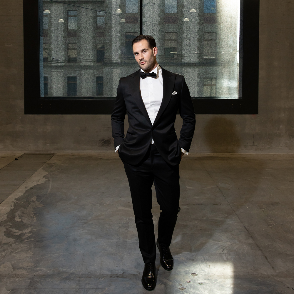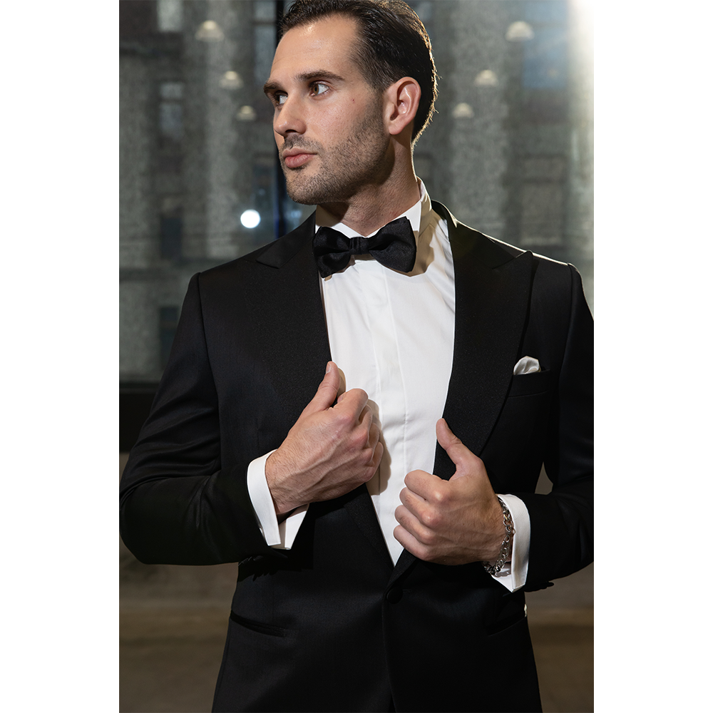 L’élégance du soir prend toute sa dimension avec ce smoking noir.